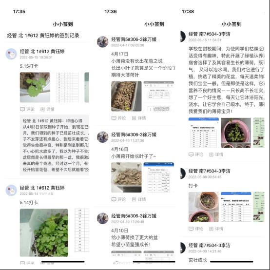 本次“绿植领养”活动实现线上线下紧密融合互动,学生参与热情高涨、反响热烈。活动开始,因为受疫情形势严峻的影响,种植条件有限,同学们自己带着小铲子在学校的花坛边、松树下挖土,用吃过的外卖盒和剪断的饮料瓶底做花盆。怀着忐忑而又虔诚的心情种下种子,浇水、晒太阳、拍照、记录打卡几乎成了同学们每天的“必修课”。交流群里常常是这一方请教取经,虚心学习,那一方交流共享,共同提高,互帮互助的友爱氛围蔚然成风。 在大家的悉心照料下,整个校园线上线下,绿意盎然,花草葱郁,一派生机。