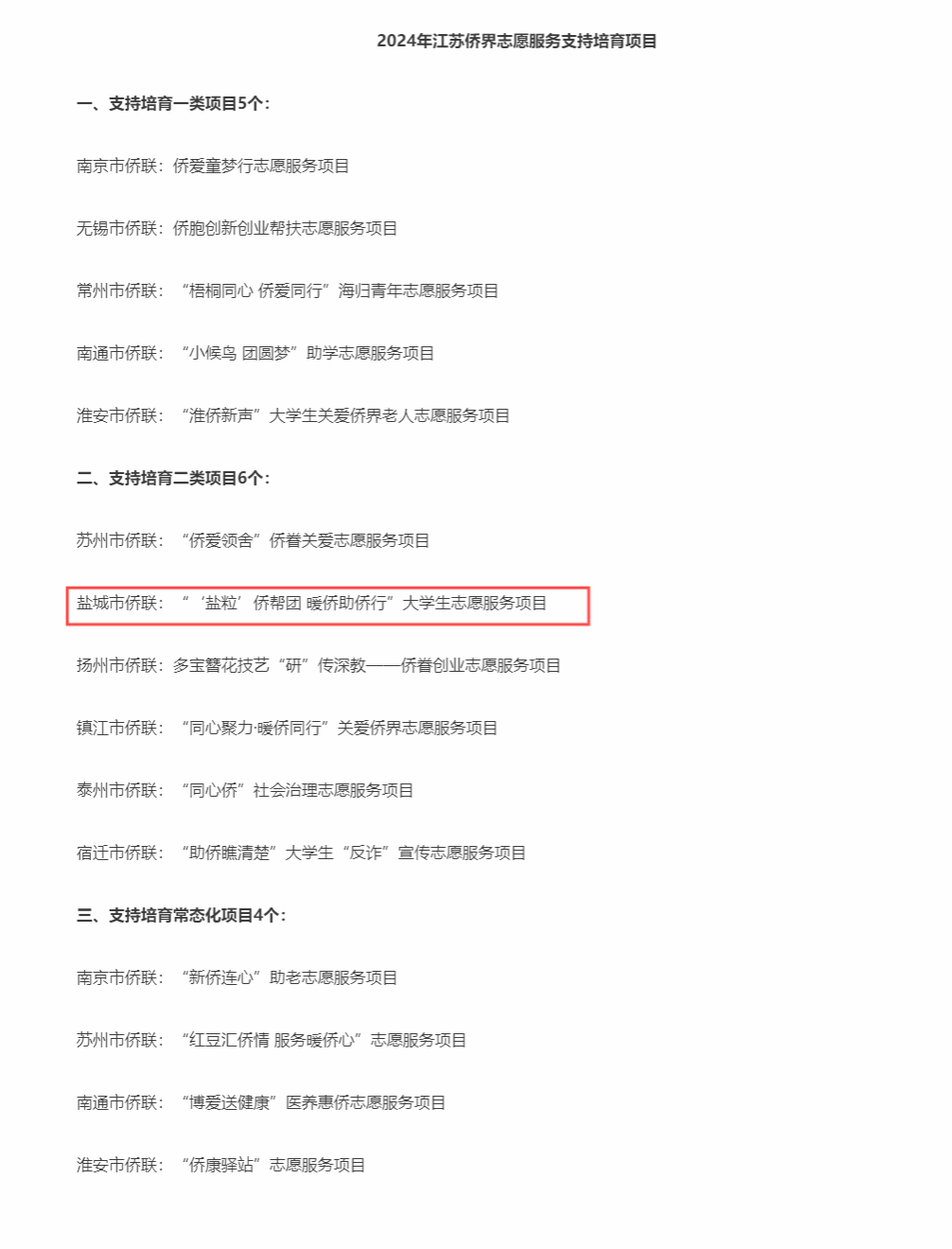 近日,2024年度江苏侨界志愿服务支持培育项目立项结果公布,我院申报的《“‘盐粒’侨帮团,暖侨助侨行”大学生志愿服务项目》获批2024年度江苏侨界志愿服务二类支持培育项目。全省共15个项目获批立项,这是继2023年《“情系归侨送温暖”大学生志愿服务项目》获得立项后,我院代表盐城市侨联再次获得该类项目立项。