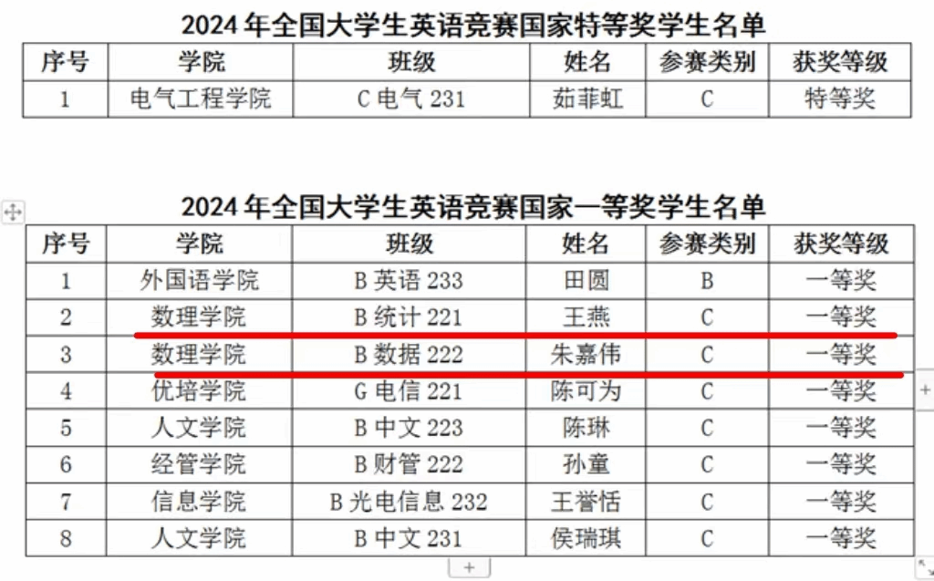 近日,2024年全国大学生英语竞赛全国决赛在东南大学落下帷幕,我院B统计221班王燕、B数据222朱嘉伟两名同学荣获C类非英语专业本科生组全国一等奖,这也是我院学生在该项赛事上首次获此殊荣。今年全省95所高校近13万名学生报名参加初赛,最终789位选手代表各校参加总决赛。我校共有1332名学生报名参赛,9人进入总决赛,我院王燕、朱嘉伟两名同学成功入选。