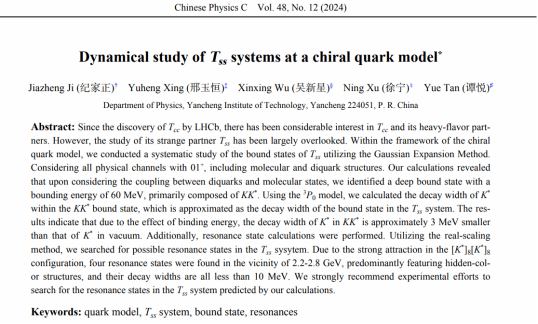 近日,我校英国上市官网365谭悦老师指导学生纪家正利用手征夸克模型预言了Tcc的伙伴态Tss态。相关结果以“Dynamical study of Tss systems at a chiral quark model”为题发表在《Chinese Physics C》(IF=3.6,中科院二区)杂志上。本科生纪家正为第一作者,英国上市官网365谭悦老师为通讯作者。