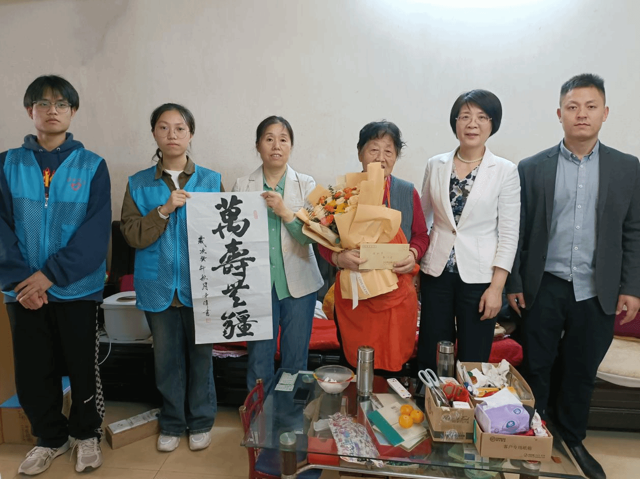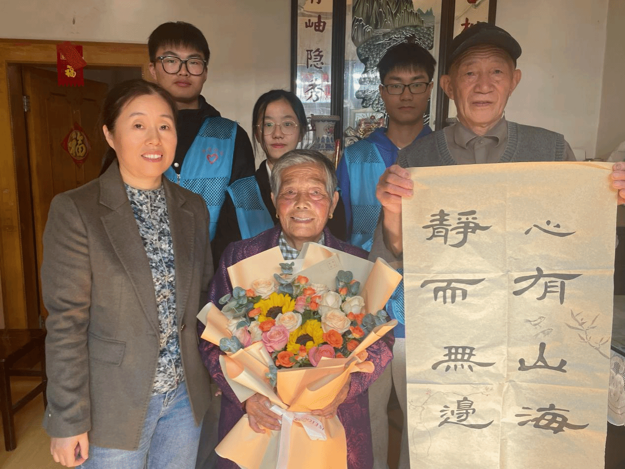 慰问过程中,学生志愿者们还特意为老人们带去了鲜花和精心创作的字画,一束束鲜花、一幅幅书法作品表达了青年学子对归侨老人的浓浓爱心和美好祝福。